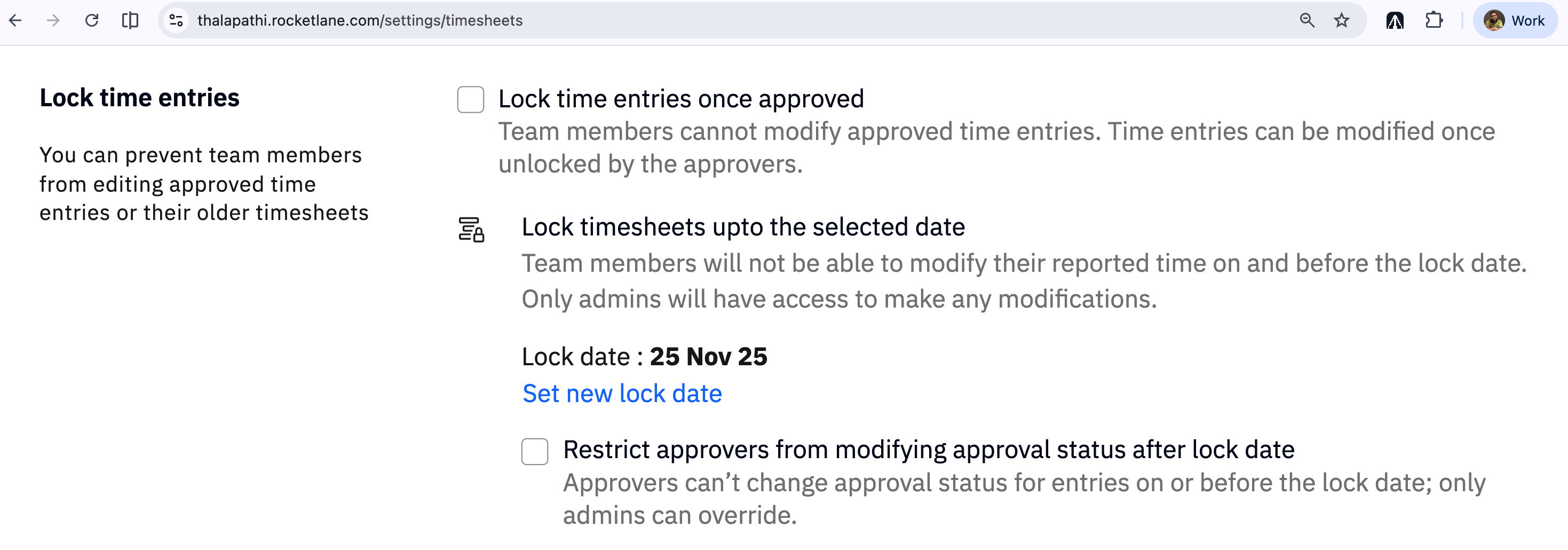 If the option to restrict approval actions on or before the lock date is enabled, approvers cannot submit, approve, reject, or withdraw entries dated on or before the lock date. Only admins can change the status of these locked entries.