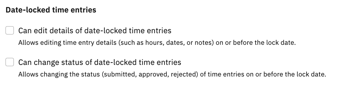 Controls whether hours, dates, and notes on locked entries can be edited.Can change status of date-locked time entries