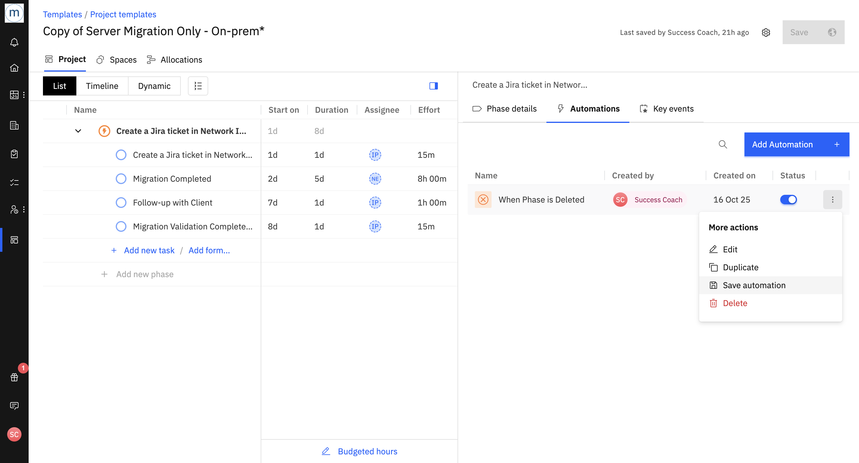 To ensure your new automation is available across other tasks and projects, you must explicitly save the automation in the template after you have created and before saving the the template it. Once the template is saved, the automation will be correctly registered and accessible for selection on new tasks.
