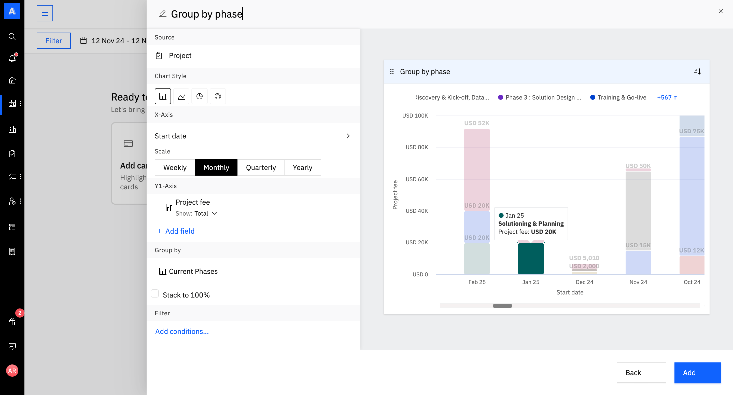 By using the Current Phase's normalized display name, all projects currently in that phase (e.g., "Design") will automatically consolidate into a single row on your chart. Furthermore, clicking on that unified row will instantly show you a list of all the individual projects that contribute to that phase count.